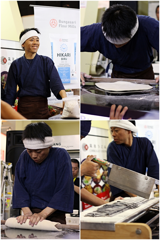 Booth Bungasari berada di Hall D2, besar dan seru deh boothnya. Setiap harinya ada 4 jadwal demo masak dan tentu saja hasilnya dibagikan ke pengunjung. Jadiiiii, booth Bungasari ini rameee terus! Kemarin kami berkesempatan meliput 2 demo masak,yaitu membuat pie susu dengan kulit pastry ala Bungasari, yang diperagakan oleh Chef Agus dan demo membuat udon dengan cara manual, yang buat udon orang Jepang asli loh, beliau adalah Chef Ryuusuuke Sakai, yang juga chef dari salah satu resto udon, yaitu Chikugo Udon.